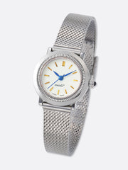 あえて経年した様なオフホワイトな文字盤に、ブルースティールのリーフ針との配色は、メリハリに加えて、光の当たる角度に応じて変化する色を楽しむことができます。